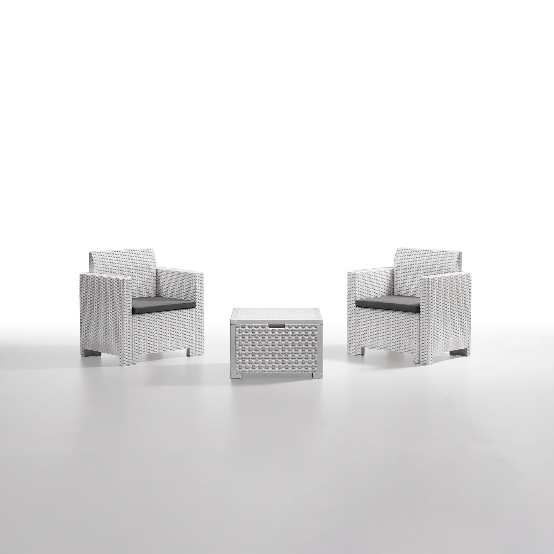 Set obuhvata sto, dve fotelje i dva jastuka.